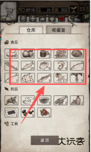 1 、先进入仓库界面,找到食品分类下的目标物品区域,通过框选方式将多件物品归集,便于后续统一处理。