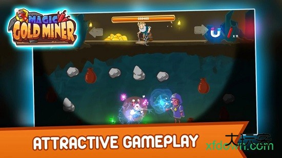 1、操控矿工在合适角度放下抓手,精准计算抛物线轨迹抓取地下金矿,通过收集黄金与宝石积累关卡所需金币。