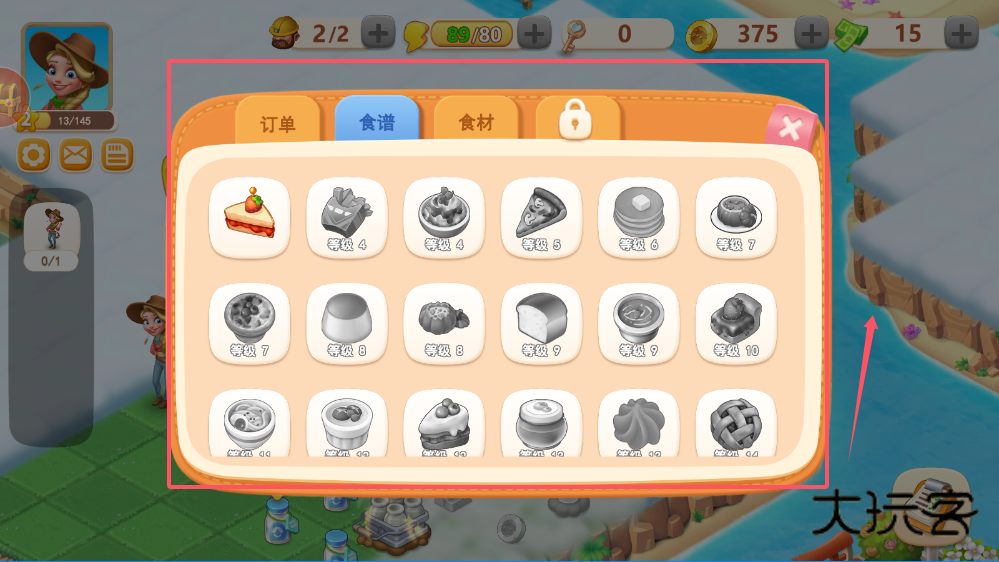 3、在食谱系统里可以看到不同等级的菜品制作条件,从简单的三明治到复杂的蛋糕都有明确等级标识,根据自己的农场等级选择可制作的菜品,完成制作能获得经验和资源。