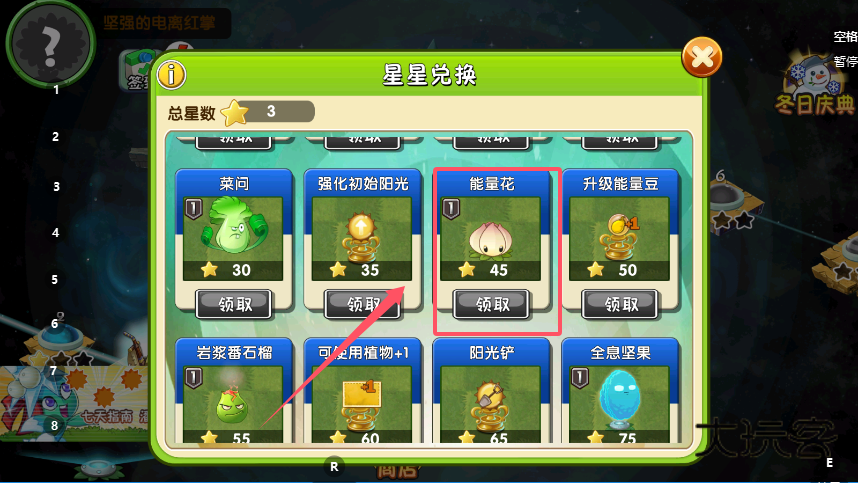 2、在星星兑换页面,查看总星数与各道具的星星要求,比如“坚果”需要8颗星星,星数达标的情况下,点击道具下方的“领取”键,即可获得对应的植物道具。