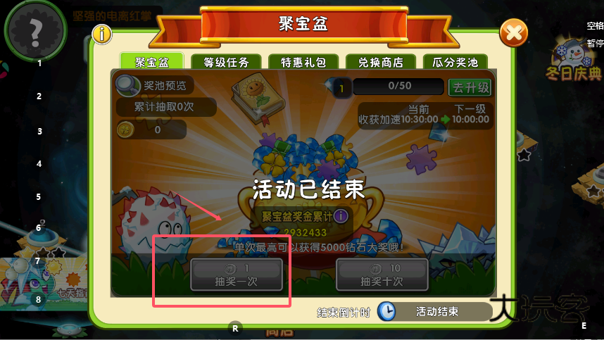 2、在聚宝盆主界面,选择单次或十次抽奖,每次抽奖都会累计次数,这些次数是提升瓜分奖池排名的关键,同时聚宝盆等级可通过成长值升级,等级提升后奖励收获速度加快。