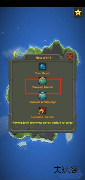 4、点击“new world”后查找“Generate islands”选项,即可进入现代岛屿生成模式。