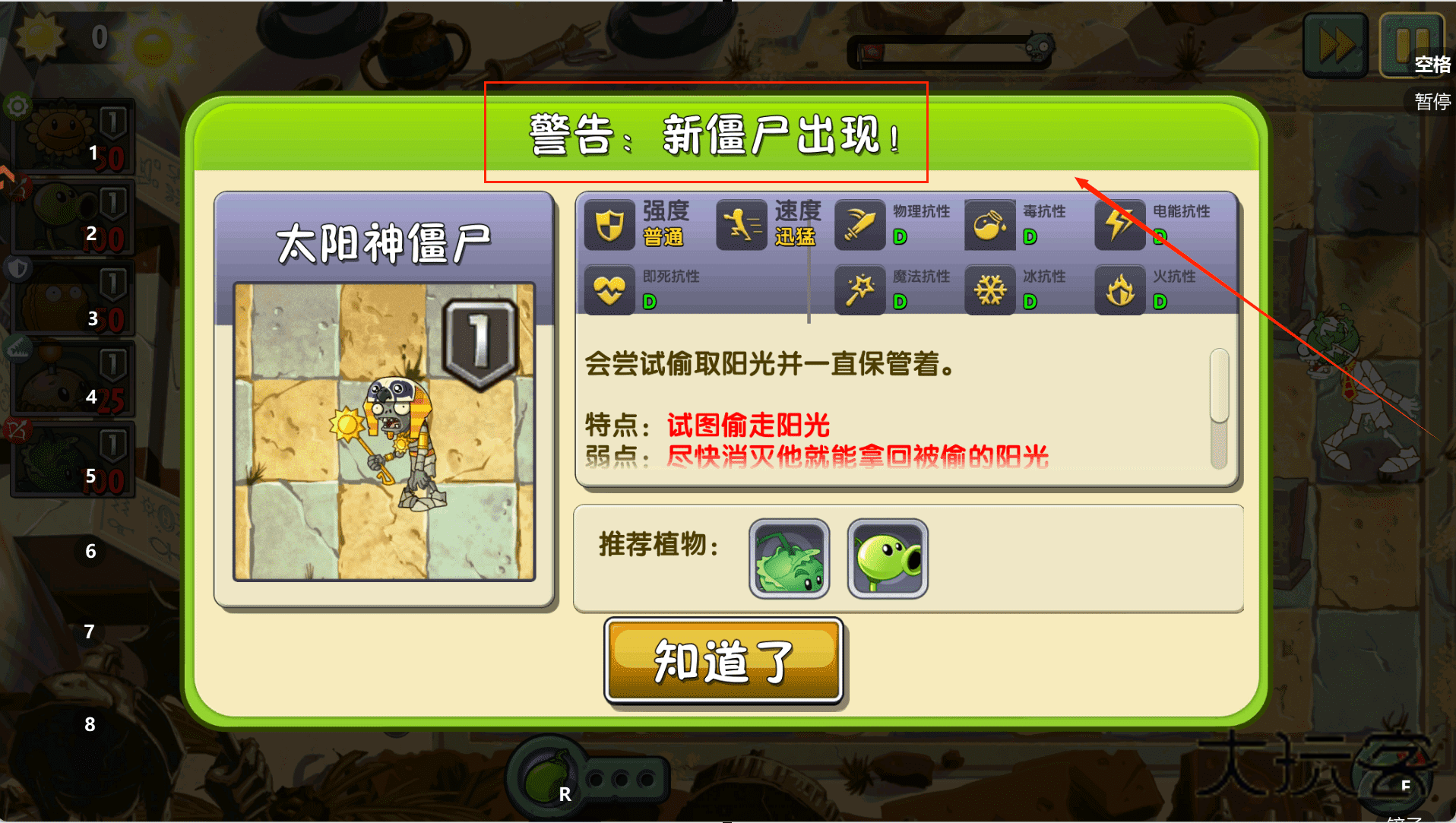 1、太阳神僵尸的特点是偷阳光,使用推荐植物迅速消灭它,以继续游戏进程。