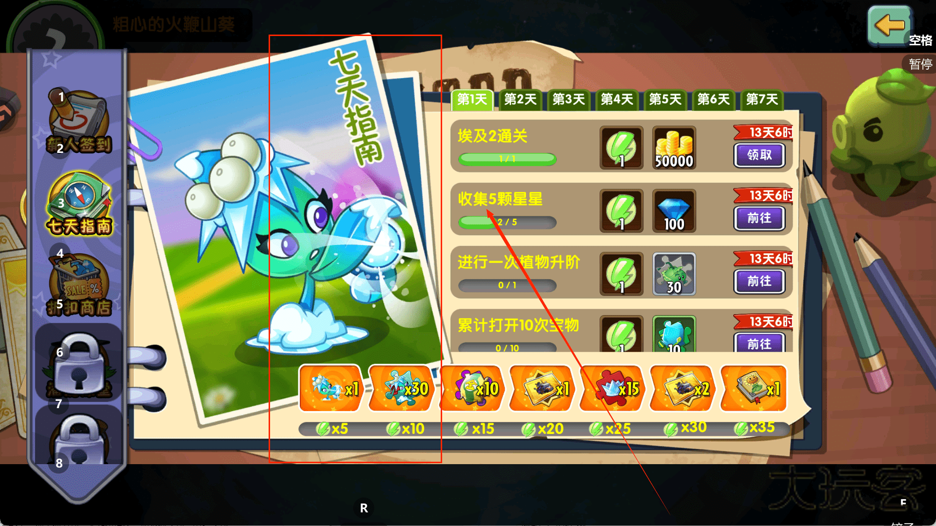 2、从“新人签到”开始收集资源哦,前几天的植物碎片和后面的钻石都要好好积累,这些在前期都很珍贵。