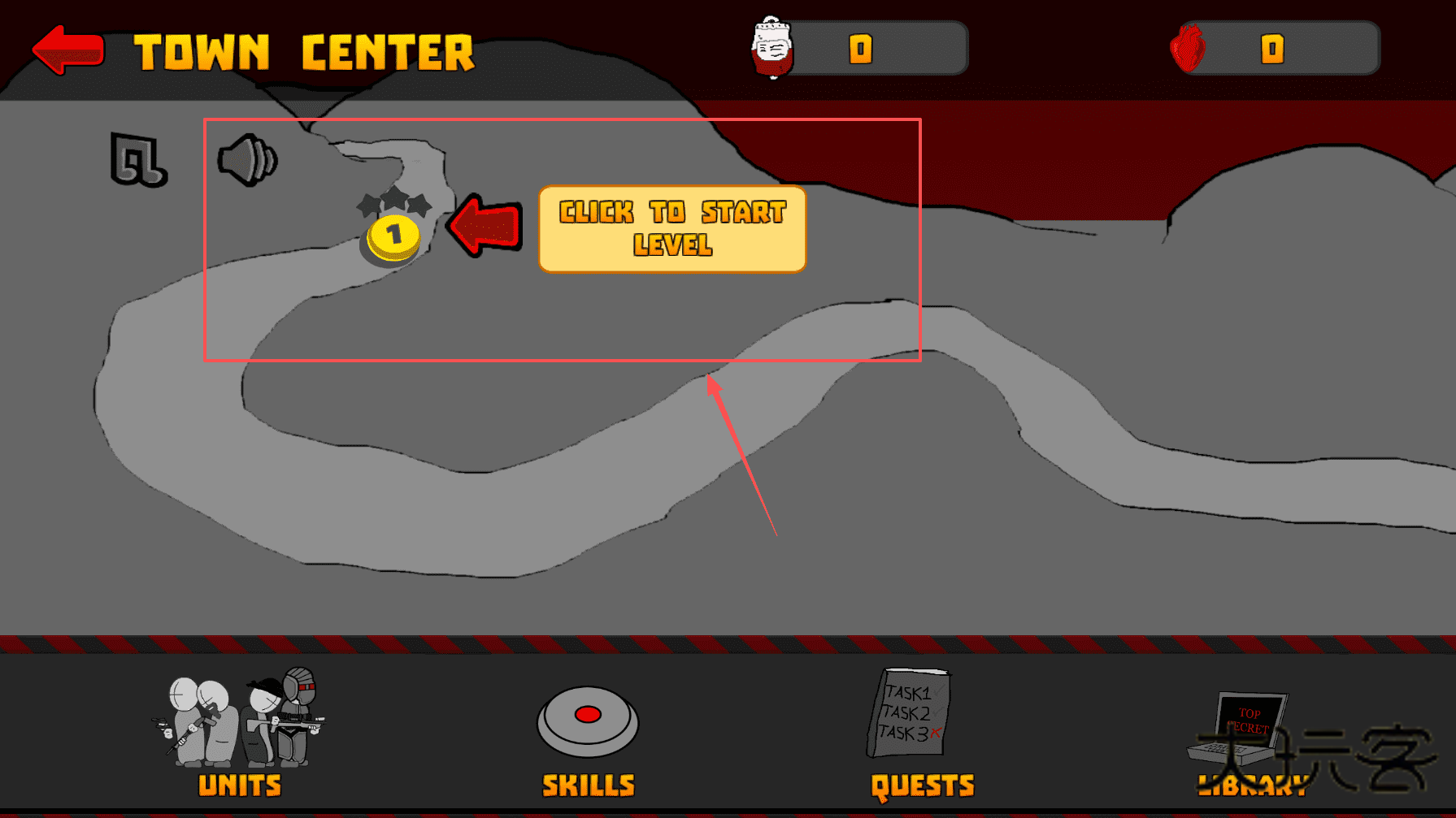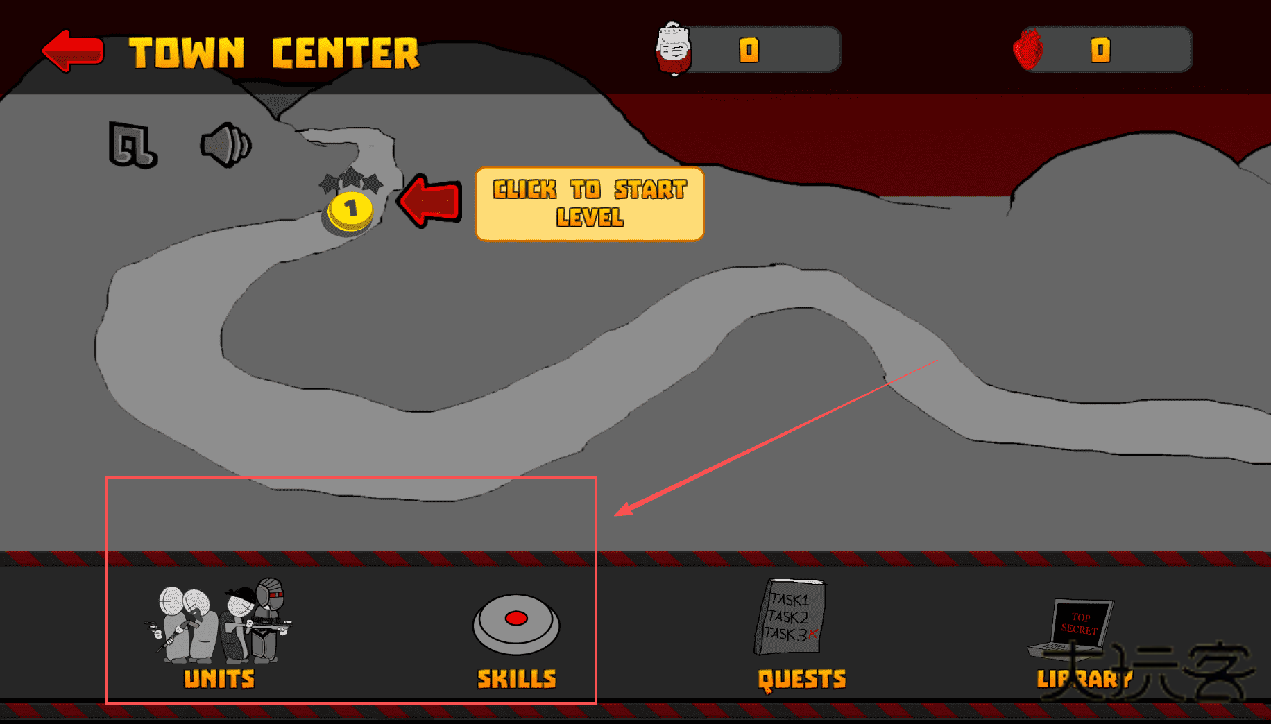 4、完成关卡或需要回顾时,你可以返回城镇中心。在那里,你可以通过“单位”和“技能”菜单升级你的能力。