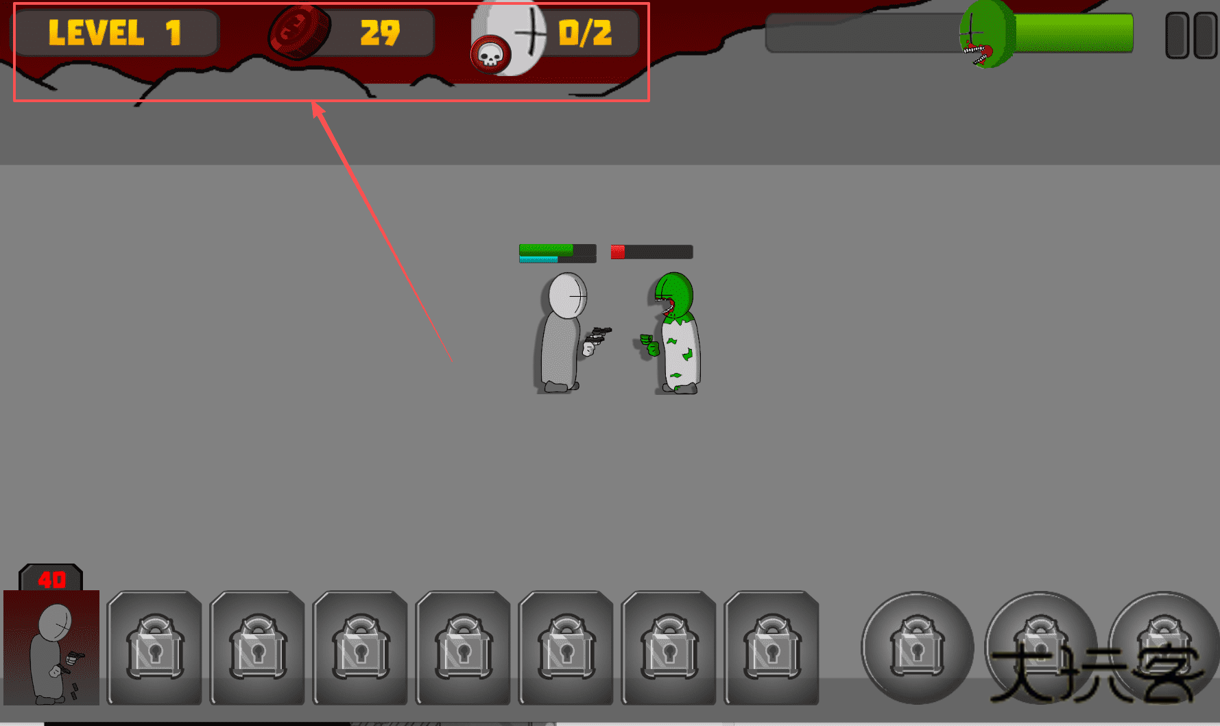2、进入关卡后,注意看屏幕上方的信息栏,那里会显示当前的关卡等级和波次,例如“等级1 29 D/Z”。