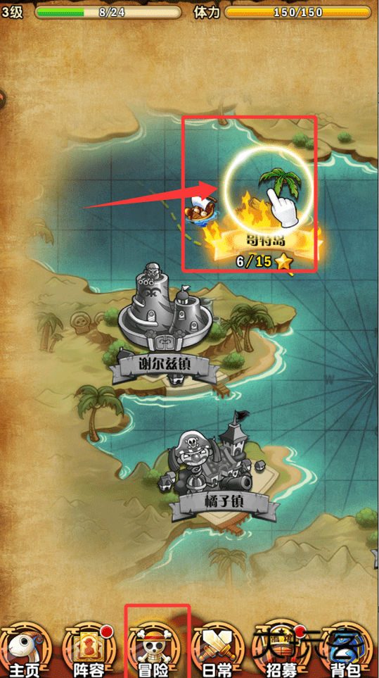 2、通过冒险界面选择并挑战已开放的区域关卡,例如“谢尔兹镇”。成功击败关卡内的敌人后,不仅能收获经验值与金币,还有机会解锁后续的“橘子镇”等新地图与剧情。