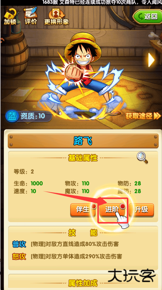 4、关卡胜利后会获得用于伙伴培养的各类素材。返回阵容界面,选定目标伙伴如路飞,在详情页中使用这些素材为其进行升级,可直接提升生命、攻击与防御等核心属性。