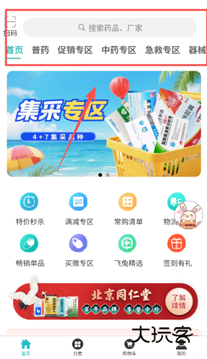 2、浏览商品,在首页或分类页面查看促销专区中药专区集采专区等分类浏览药品信息或直接搜索药品名称。
