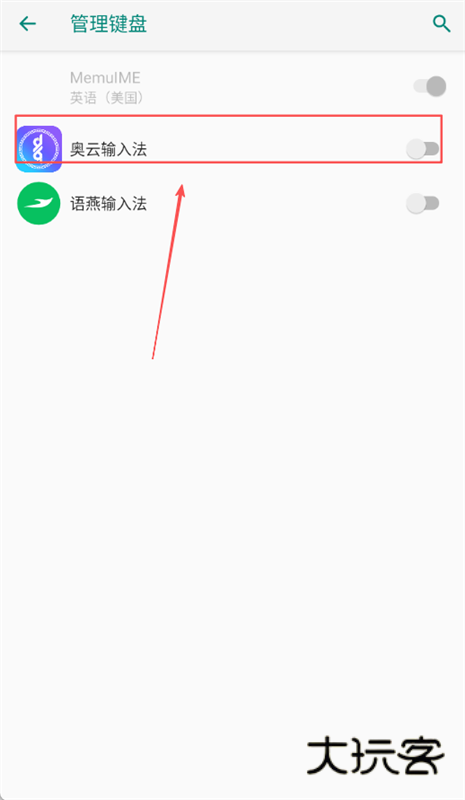 2、点击切换输入法选项进入选择列表,在管理输入法列表中选择奥云输入法进行确认切换操作。