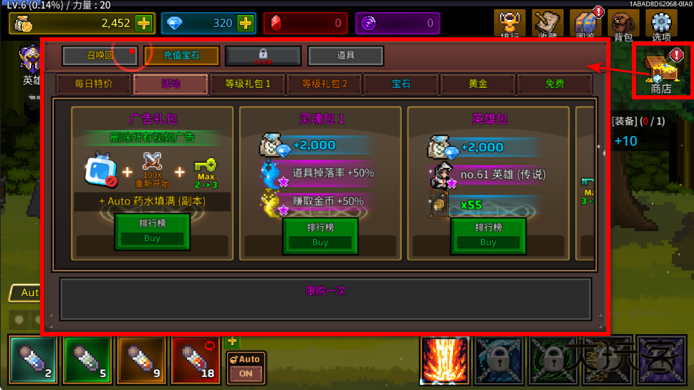 英雄攻击敌人,会掉落各种装备,通过右上角的背包可以查看物品。