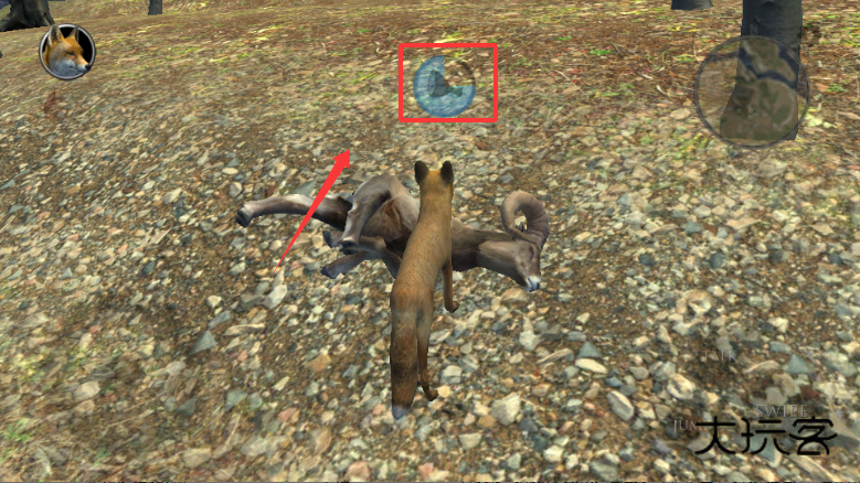 2、在荒野探索过程中需要寻找各类食物资源,发现兔子等小型猎物后可快速靠近并发动扑击,成功击败后即可通过进食按钮补充体力与经验值,同时还需警惕主动攻击的大型野生。