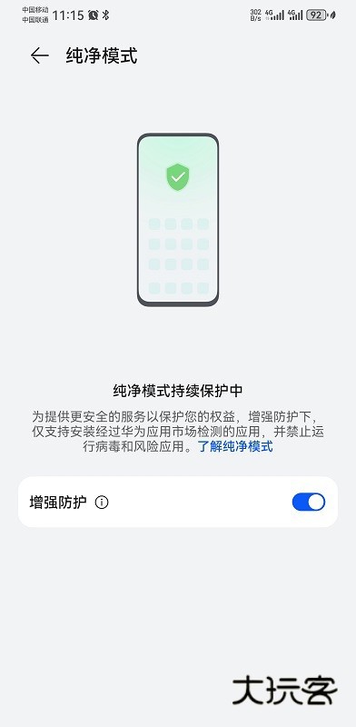 默认是开启的,把增强防护关闭掉,即可关闭纯净模式!