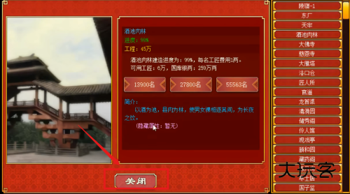 1、国库储备三百三十五万两白银,在建造界面选定演武场项目准备投入工程建设。