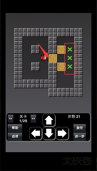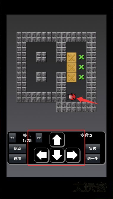 2、进入关卡后,通过点击屏幕上的方向按钮来控制角色移动。每次点击会让角色朝对应方向走一格,推动沿途的箱子。