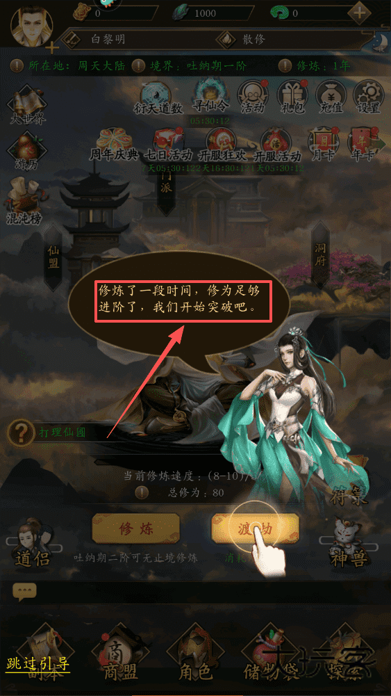 3、修炼操作很简单,在主界面点击修炼按钮,等修为足够后,就能点击渡劫尝试突破境界了。
