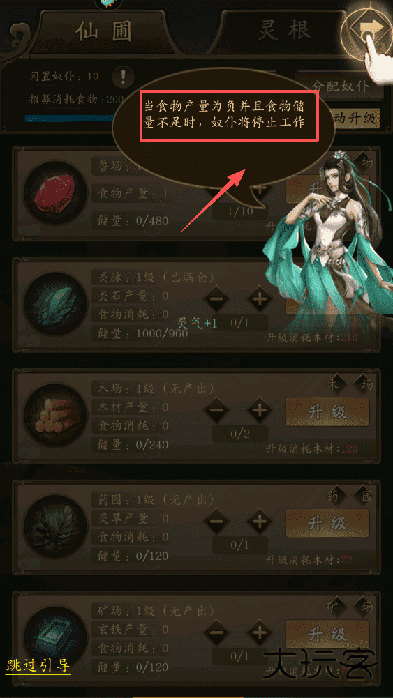1、管理资源时,记得先点击仙圃,分配奴仆到兽场确保食物产量为正,否则奴仆会停止工作哦。