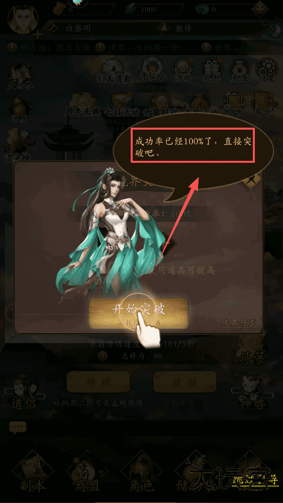 4、突破时注意查看成功率,如果不足100%,可以使用法元丹提升概率,然后再点击开始突破按钮。
