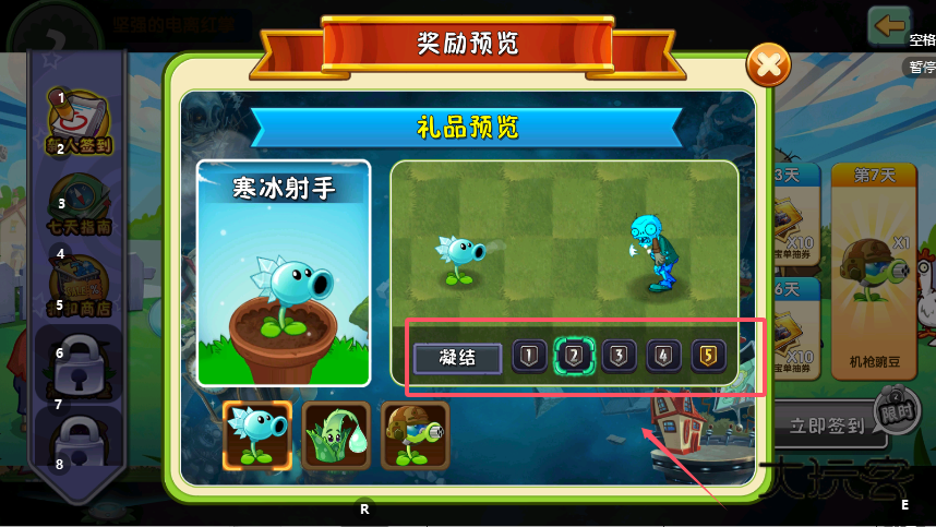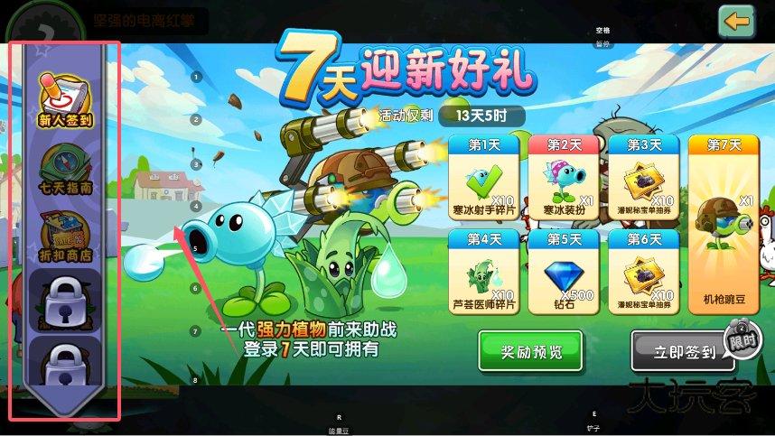 3、界面右侧的奖励列表中,会明确标注不同签到天数对应的具体奖励,例如第3天可能获得金券,而连续签到第7天则可解锁“机豌豆”等特殊植物。