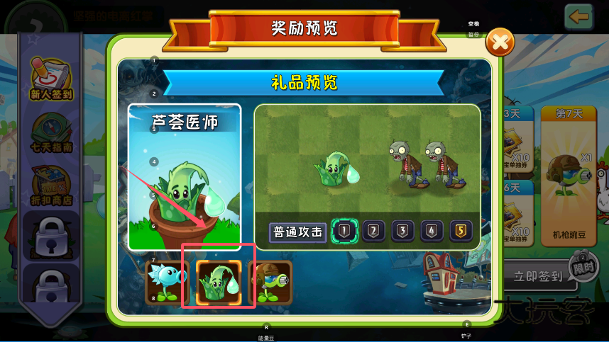 2、在“奖励预览”页面的中心区域,会清晰展示当前签到的核心奖励内容,例如“芦荟医师”等植物的形象与属性。右侧通常按天数排列着从第3天到第7天不等的阶段性奖励预览。