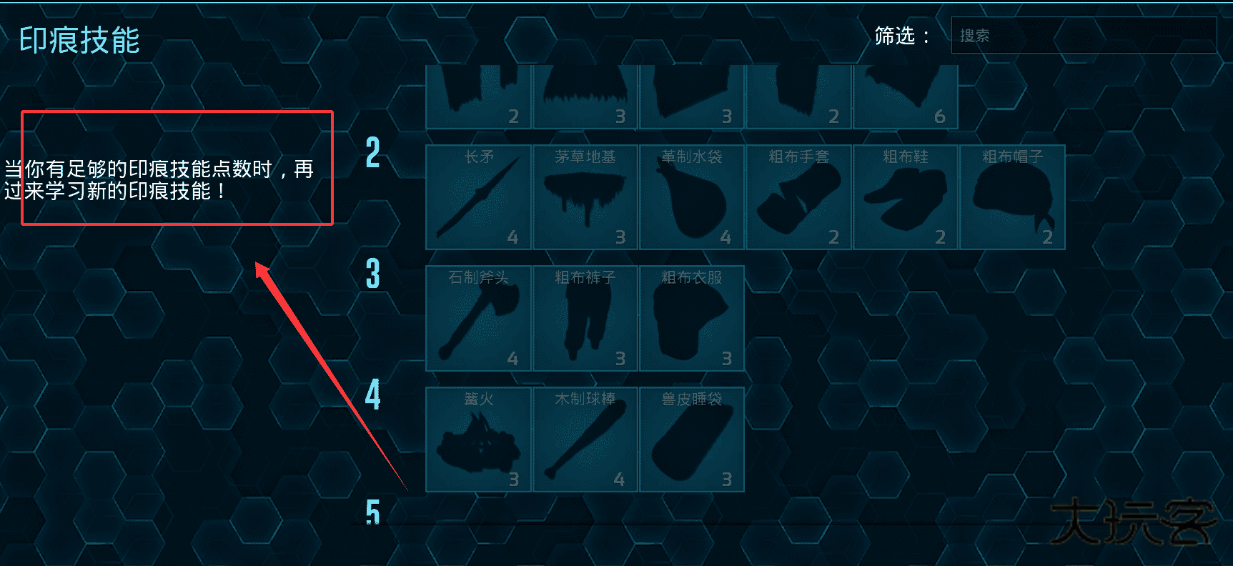 4、印痕技能点数用来学习制作配方,升级后记得查看新解锁的物品,比如2级可学长矛和茅草地基。