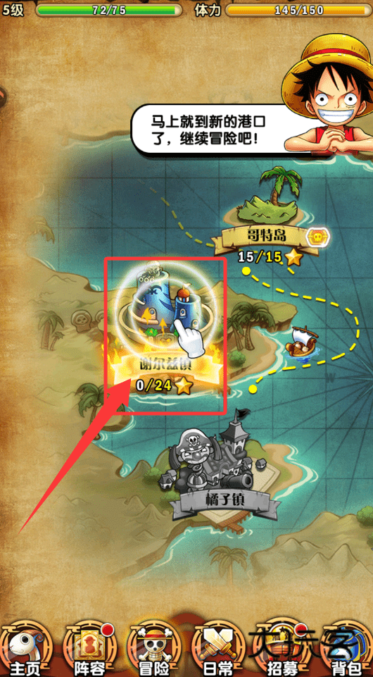 2、首次登录后,主界面会展示当前可推进的剧情地点,例如完成“哥特岛”后可解锁“谢尔兹镇”。选择目标地点即可进入具体的关卡挑战列表,开启新一轮冒险。
