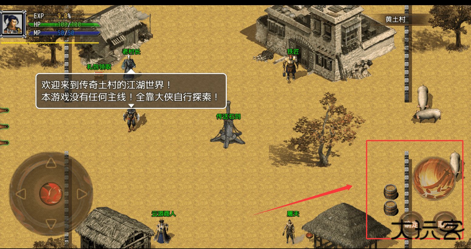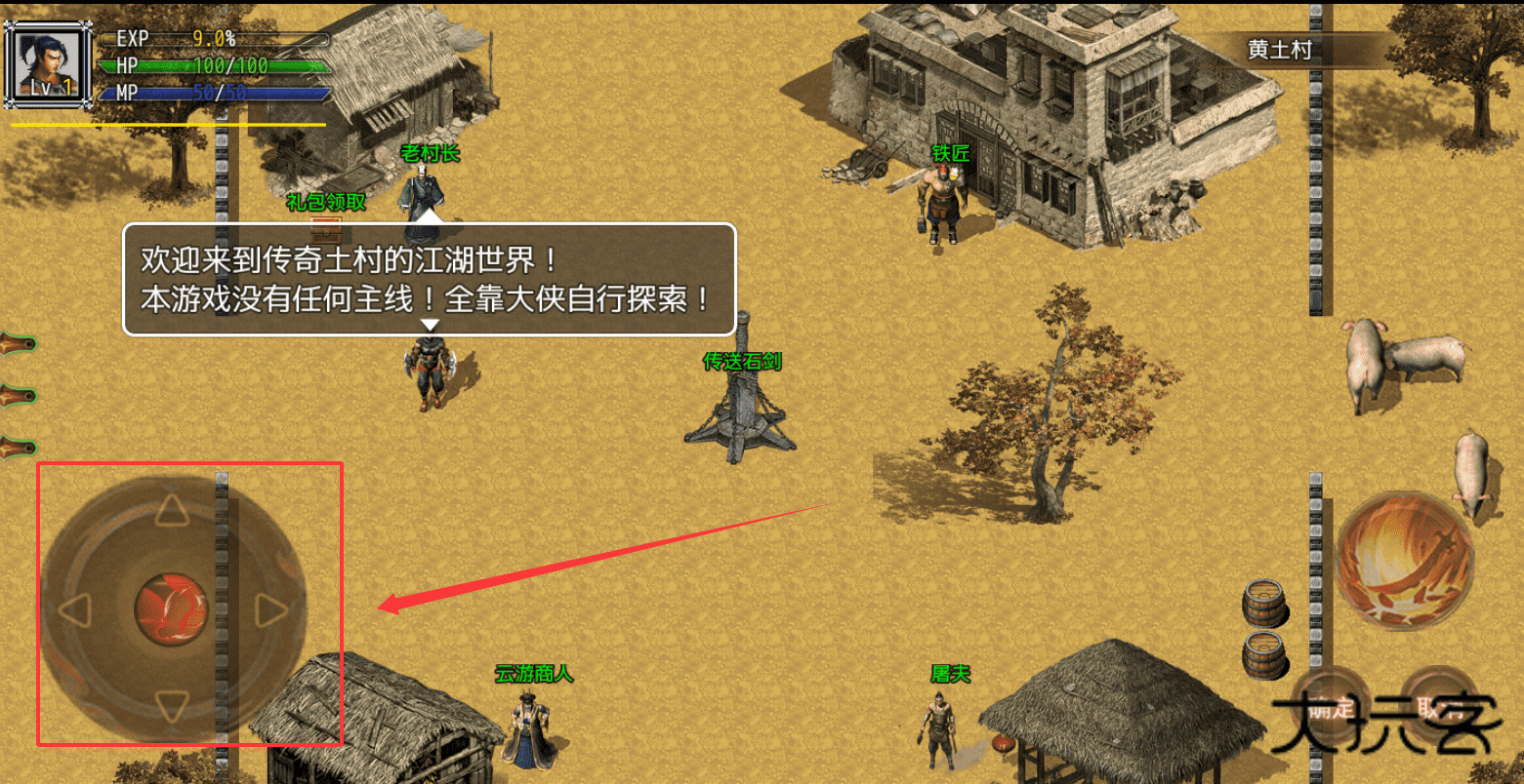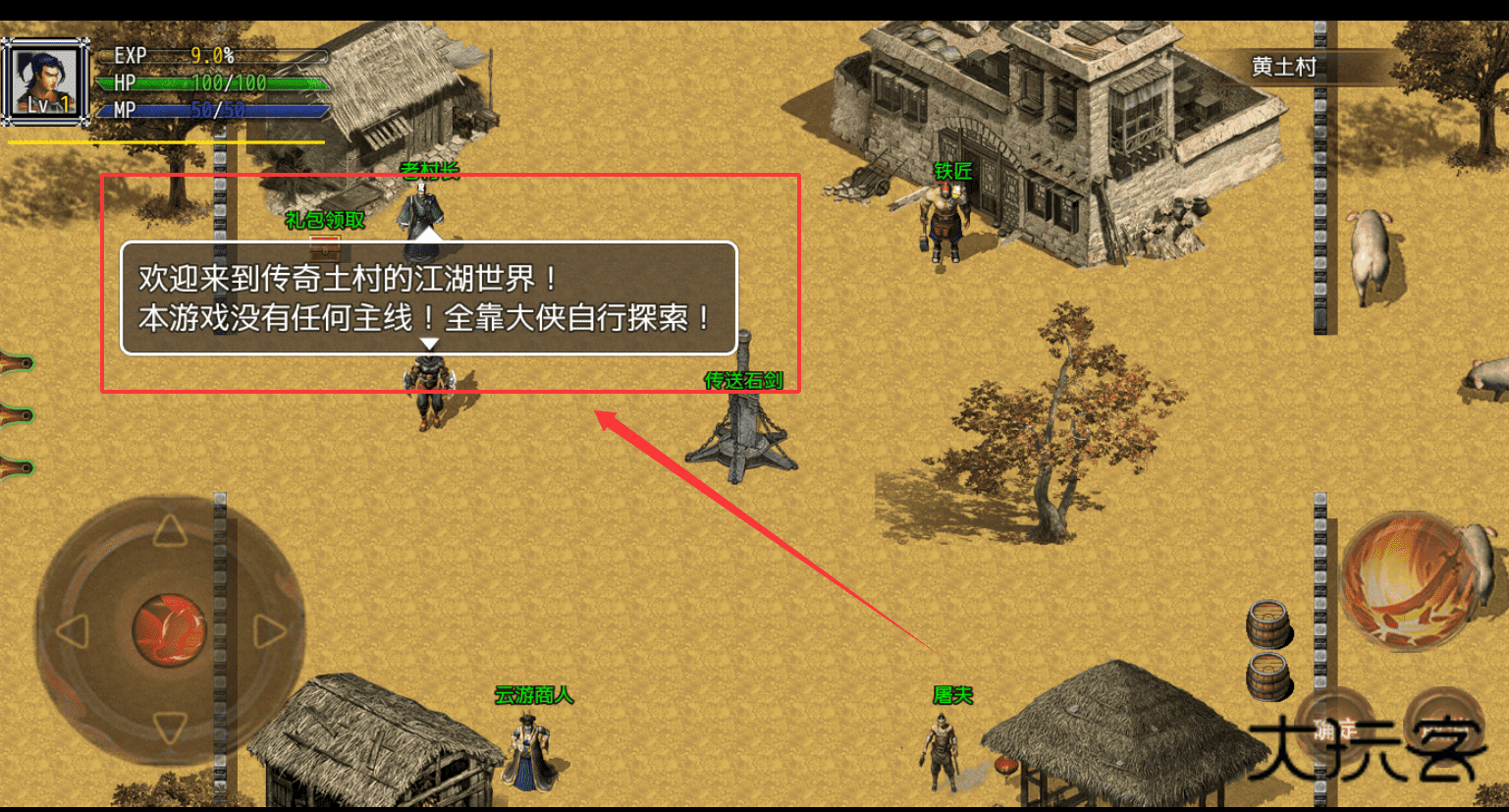 3、游戏的核心玩法是自由探索,所以不需要急着找任务,可以先在黄土村到处走走,和村民对话,熟悉一下操作和界面。