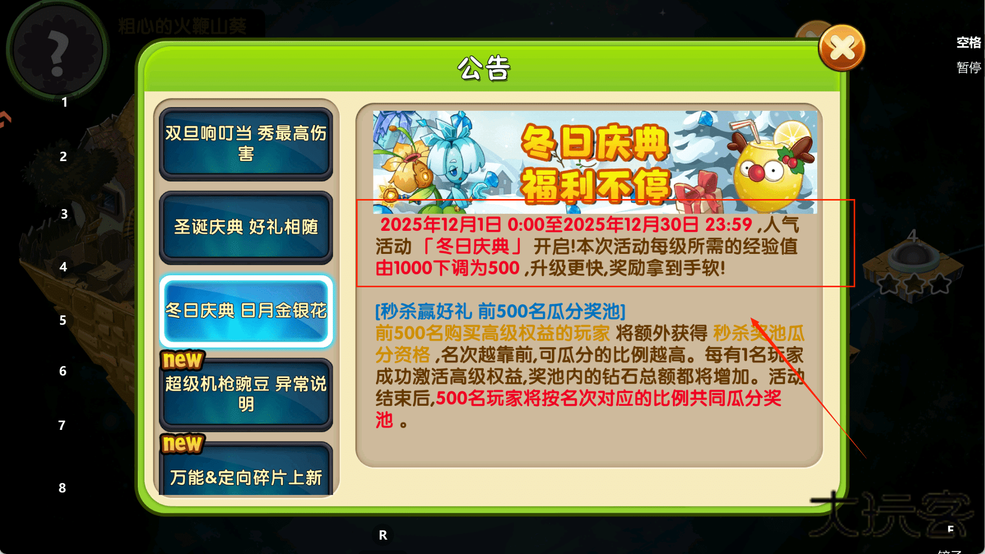 2、对于“冬日庆典”中“高级权益”的购买,需要根据自己的情况量力而行,如果想参与瓜分钻石奖池,就要尽早购买并冲击靠前名次,这可能带来可观的钻石收益。