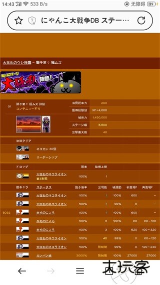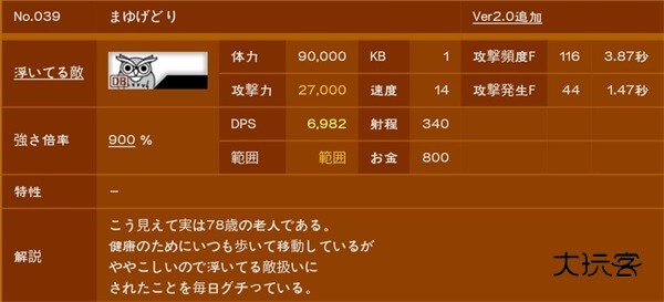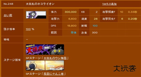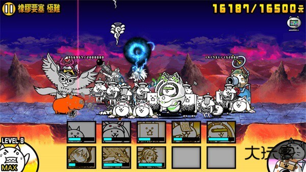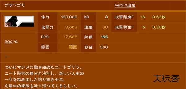 超高伤害,射程也长,攻频也不低,射程低于390的基本摸不到,量产炮灰一击死,大多数人在打大狂墙时都没有能真正稳住的炮灰,不过,经过测试60来级满生命本能加体力联组的拉面王是可以抗住一下的,有能力的可以试一试。回到正题,变态的血量是塔的两倍多,可以尝试偷塔,若要正攻,主力大猫射程最好要在440往上,这关对大狂墙的击退尤为重要,1kb意味着没控制的话它到死都不会退后一步,所以推荐使用狼女等有效击退角色,配合狙击效果更佳