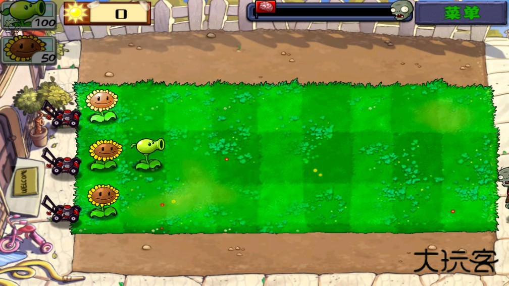 4、在僵尸行进路线上布置豌豆射手进行攻击,通过关卡可解锁新植物种类。