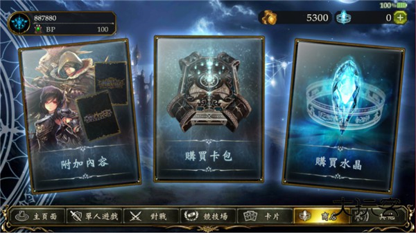 六、商店:附加内容、购买卡包、购买水晶。附加内容大致为购买不同类别的卡背以及主站者造型的选项,需要消耗金币以及相对应的钻石进行消费,同时有部分活动卡背可免费购买