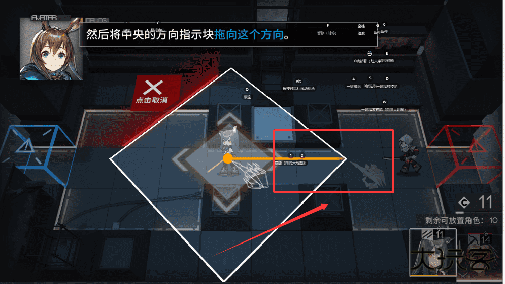 2、放好干员后调整方向,把画面中央那个白色指示块拖到你希望他面对的方向就行啦。