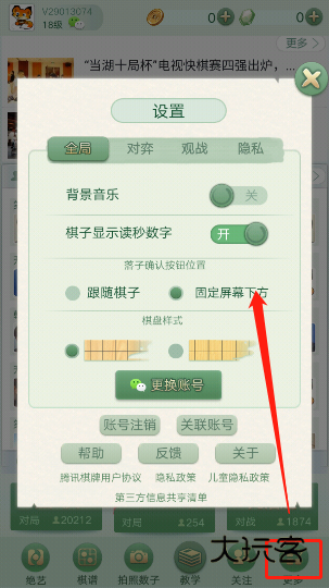 2.点击“更多”进入设置,我们可对游戏对弈以及观战、全局等游戏画面进行自定义的辅助设置