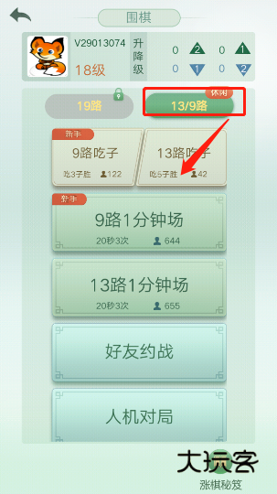 4.手游版本目前支持围棋、九路飞刀和死活题等三种玩法,初次进入游戏的玩家在“围棋”模式下仅开放13、9路的玩法
