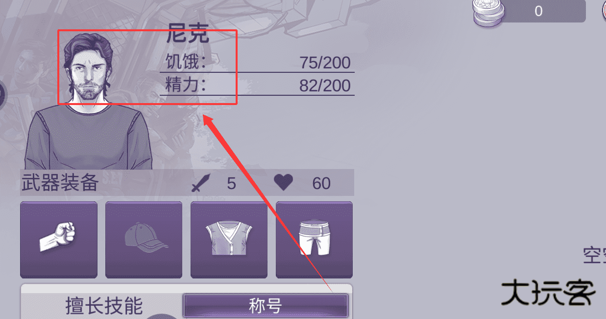 3、购买完资源后,记得去角色界面(就像尼克的属性页)查看和使用它们。在那里你可以看到角色的饥饿值、精力值以及“武器装备”和“擅长技能”的情况。