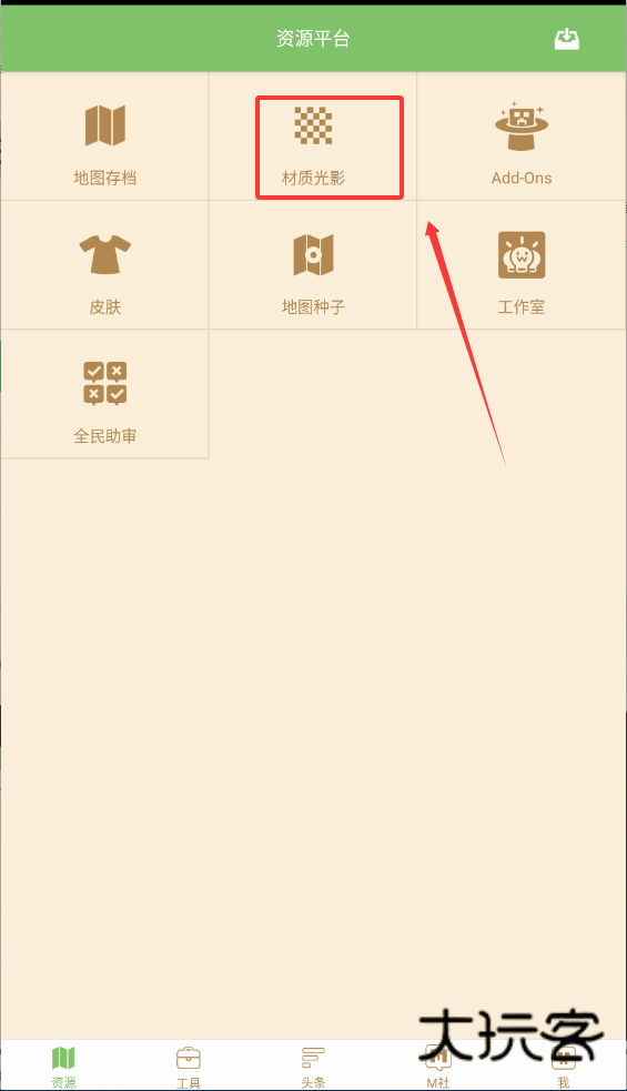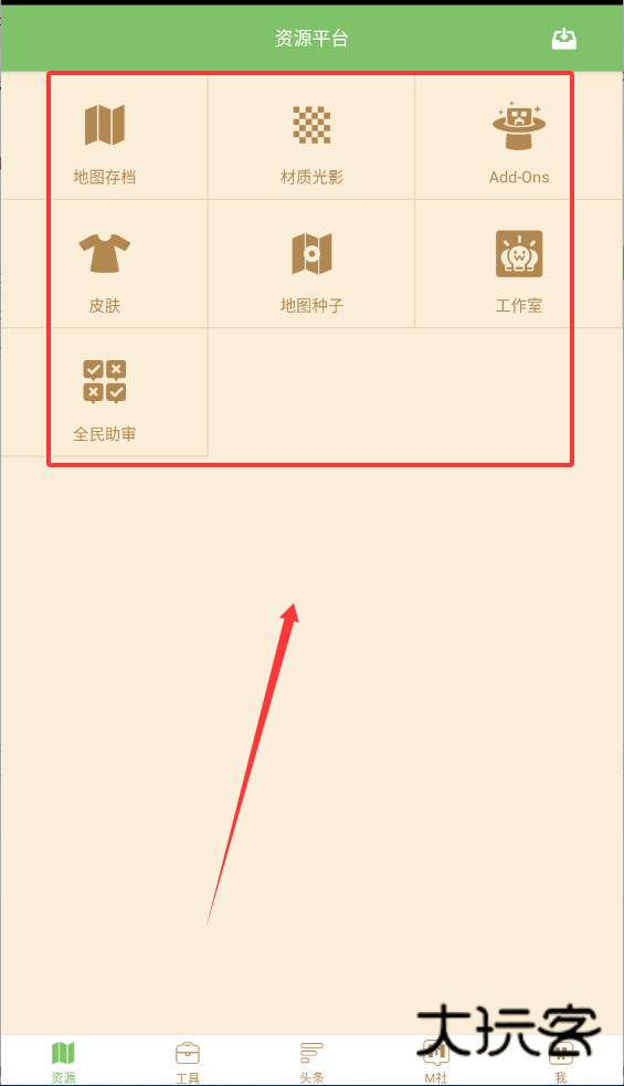 1 、软件主界面设计兼顾美观与实用性,上方绿色导航栏清晰醒目,下方多个功能板块如地图种子、资源等以图标搭配文字的形式规整排布,确保了操作流程的直观与便捷。