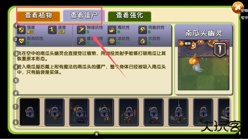 1、启动游戏,在顶部功能区域点选“查看僵尸”选项卡,即刻进入僵尸资料库,界面布局分明,左侧为严谨的属性数值面板,右侧则是当前选定僵尸——南瓜头幽灵的视觉化呈现。