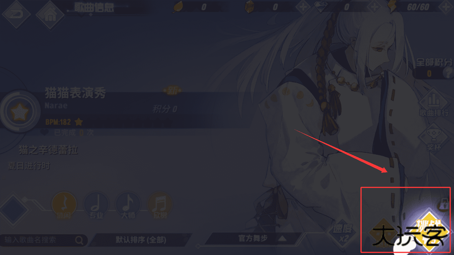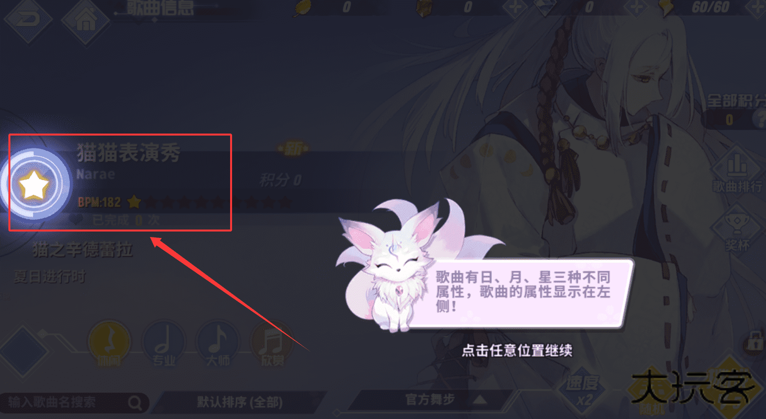 2、选择歌曲时要注意左侧的信息,就像第三张图提示的,歌曲有日、月、星三种属性。