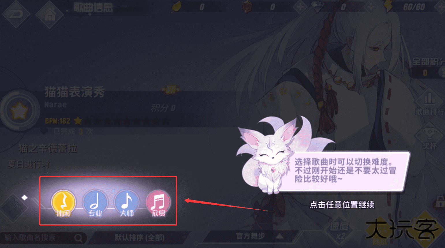4、完成一局后,你可以返回选歌界面尝试其他歌曲或更高难度,记得游戏里很多界面都有“点击任意位置继续”的提示。