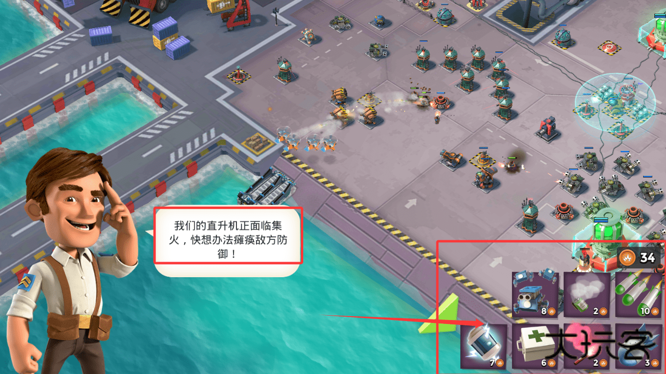 《海岛奇兵》从沙滩指定范围内登陆。然后在海面上有战舰提供导弹、医疗支援,同时还能释放引导弹进行实时打击目标指挥。至于坐着登陆艇成功冲上岸的士兵,全自动战斗,会优先攻击最近的建筑,这时就需要你引导他们集中火力,打掉敌方防御工事先。最后,只要摧毁敌人的司令部就能引爆敌人整个基地,获得胜利,拿到战利品。
