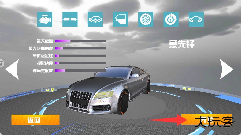 4、在车辆库中挑选心仪的跑车或经典车型,点击确认后进入改装工坊开始调整。