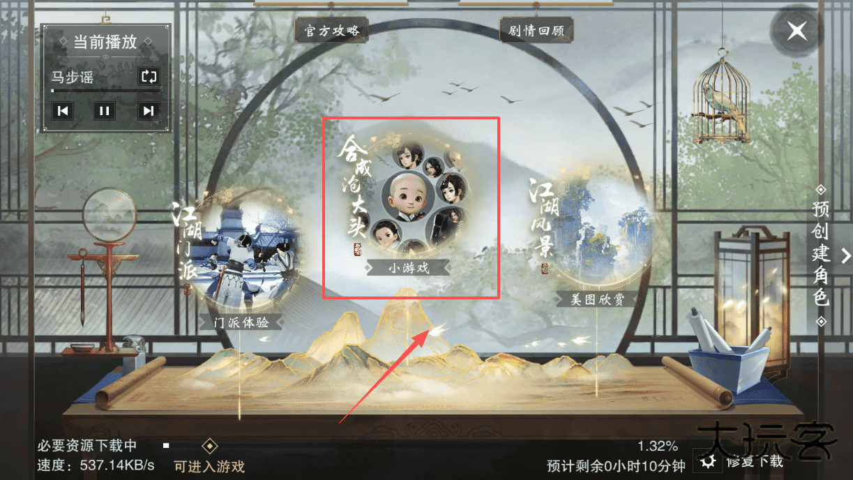 3、在主界面,你能看到山水等古风场景。上方有“官方攻略”和“剧情回顾”,左侧可控制音乐播放,中间还有“合成泡大头”等趣味小游戏可以探索。