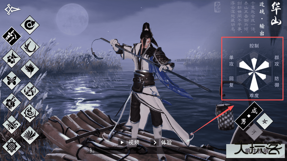 1、进入游戏后,先点击底部“体验”按钮。在角色选择界面,你可以看到华山这个近战输出职业,并通过雷达图了解其特点,还能观看技能视频呢。