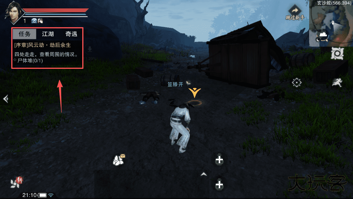 4、游戏时,注意左上角的任务栏和角色信息,右上角有小地图和“跳过新手”选项。屏幕下方有一排功能按钮,方便你进行各种操作。