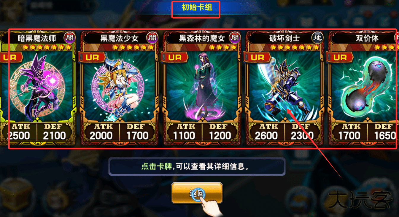 2、游戏初期会获得一套包含“暗黑魔法师”、“黑魔法少女”等经典怪兽的初始卡组,每张卡牌均有独特的攻击力、防御力与稀有度标识,点击卡牌可查看其详细效果说明。