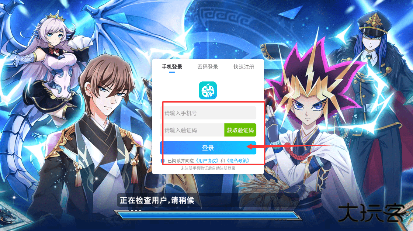 1、进入游戏后首选手机号验证方式完成快速注册与登录,在输入验证码前需要勾选同意用户协议及隐私政策条款,系统验证通过后便正式进入决斗者大厅开启卡牌收集之旅。