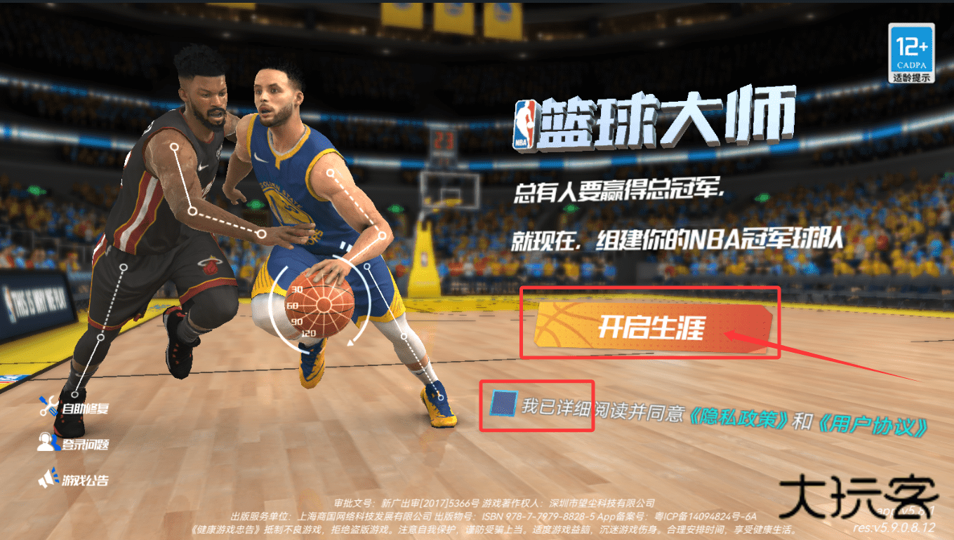 1、初次启动游戏时,需要同意相关的协议条款并点击“开启生涯”,由此开始扮演球队经理的角色,核心目标在于组建与管理一支属于自己的NBA球队,向总冠军发起冲击。