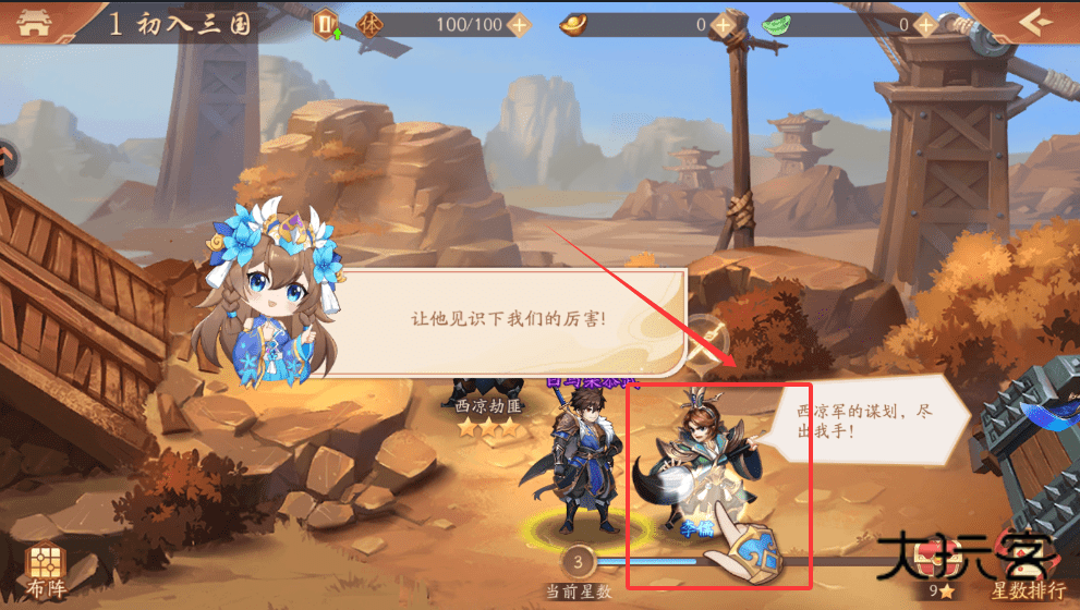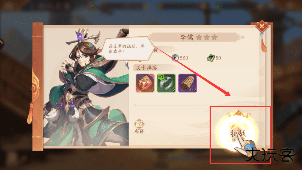 1、点击右下角的“布阵”可以调整阵容,准备好后,就点击消耗50体力的“挑战”按钮,去打败李儒这些西凉劫匪吧。