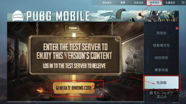 1.想要获得体验服的邀请码你需要登陆pubg的正式服,在正式服的登录界面的右上角找到推荐活动,然后点击下方的先行服界面