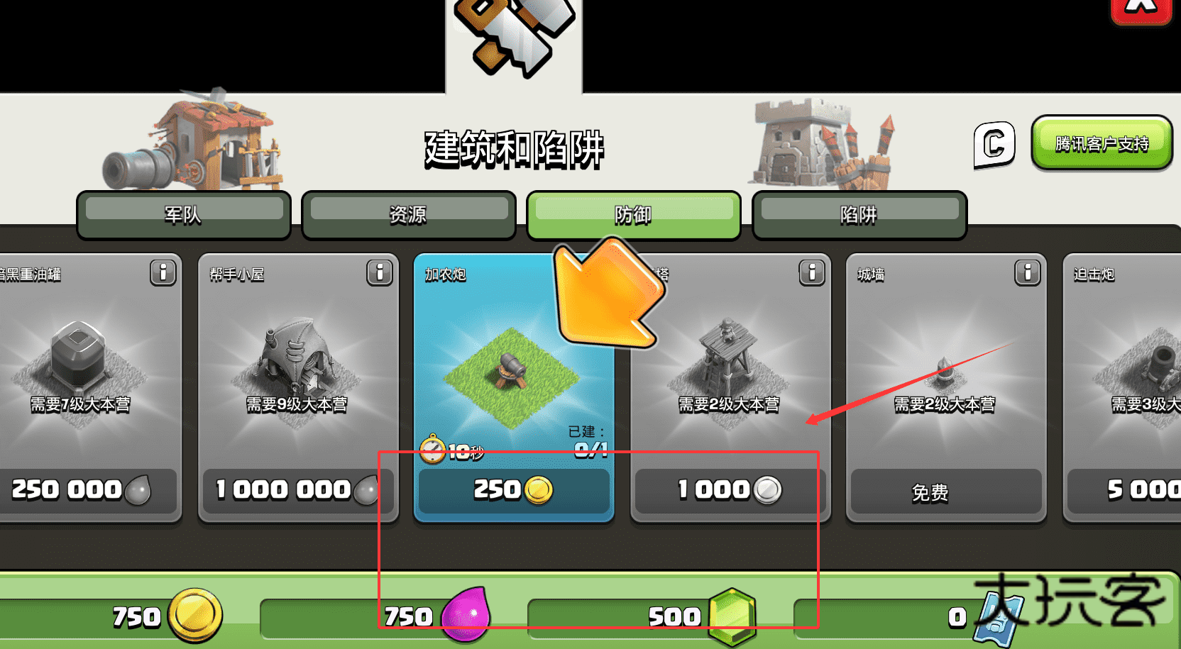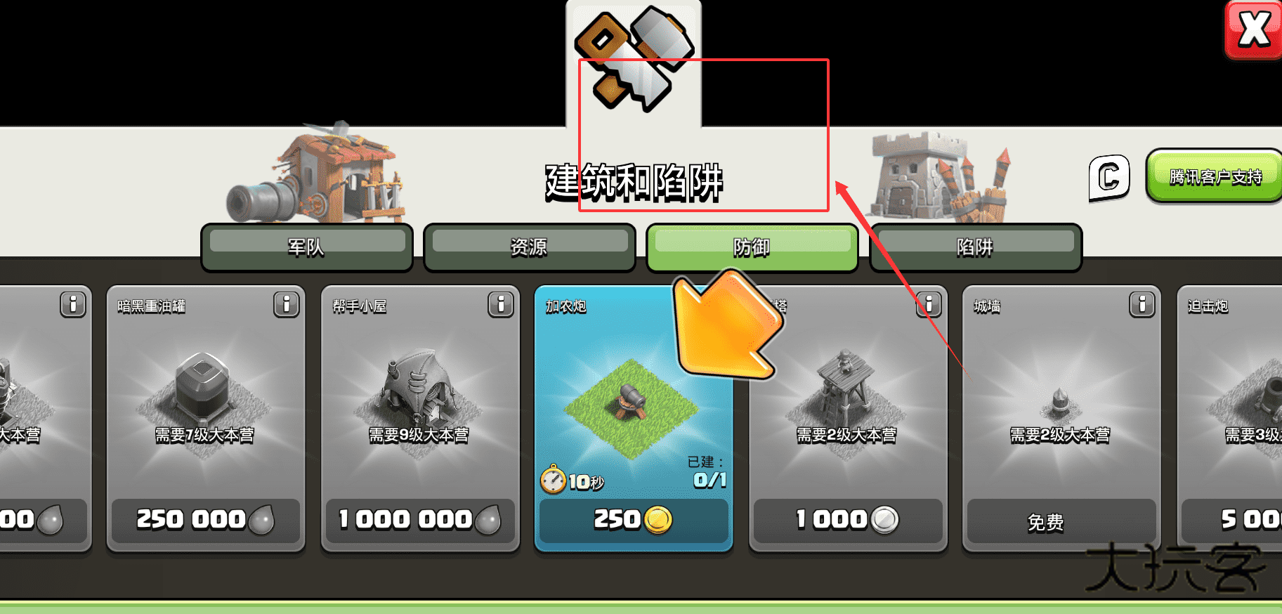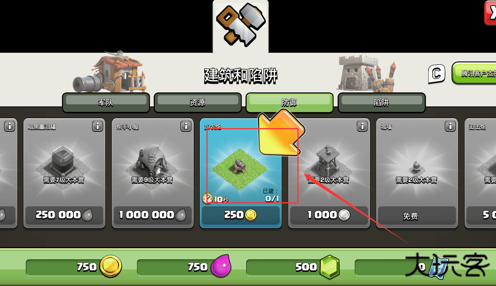 3、建造或升级的操作很简单啦,就像第三张图展示的那样,选中像“加农炮”或“超击炮”这样的项目。